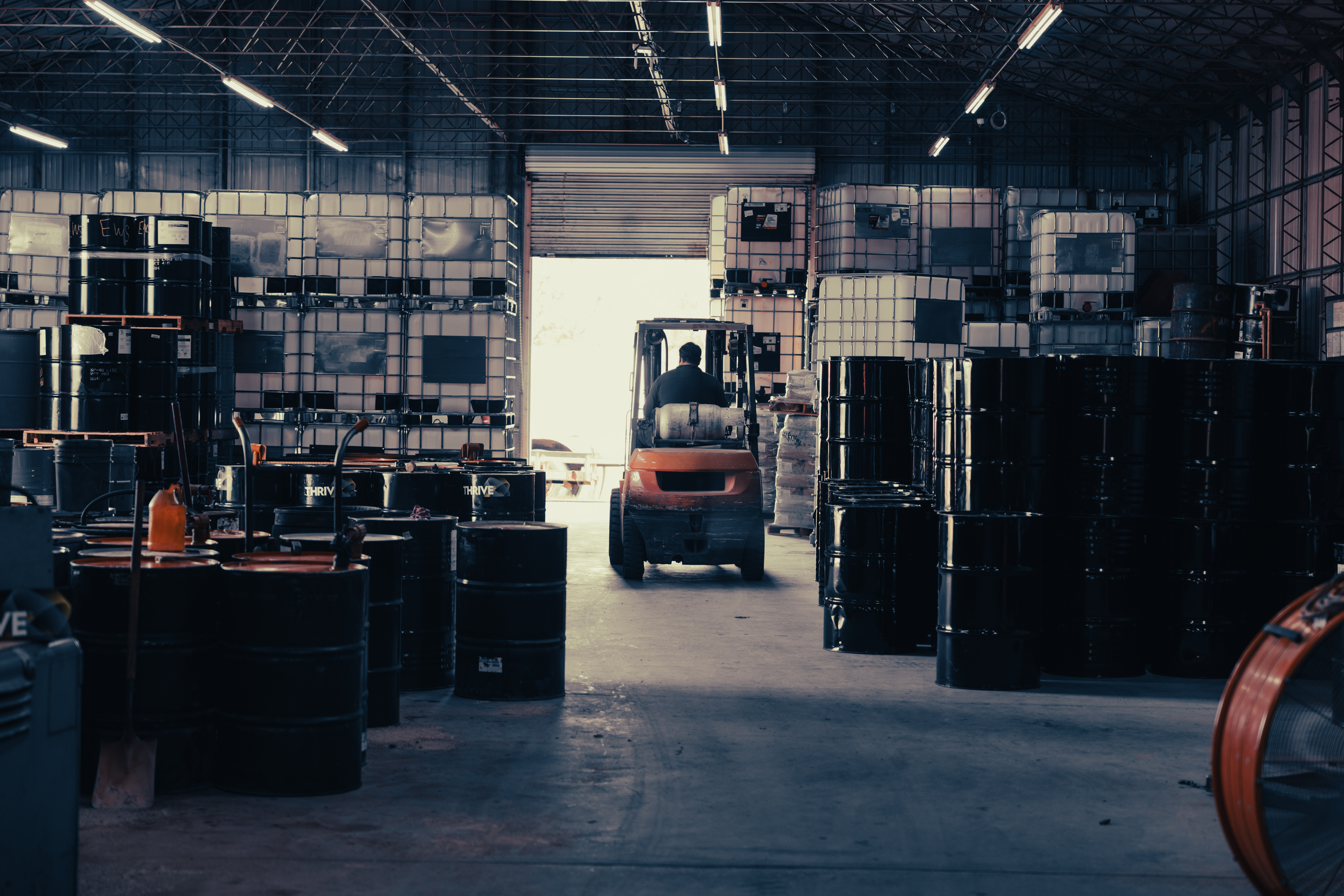 A forklift driving through a U.S. Lubricants warehouse full of THRIVE totes and drums